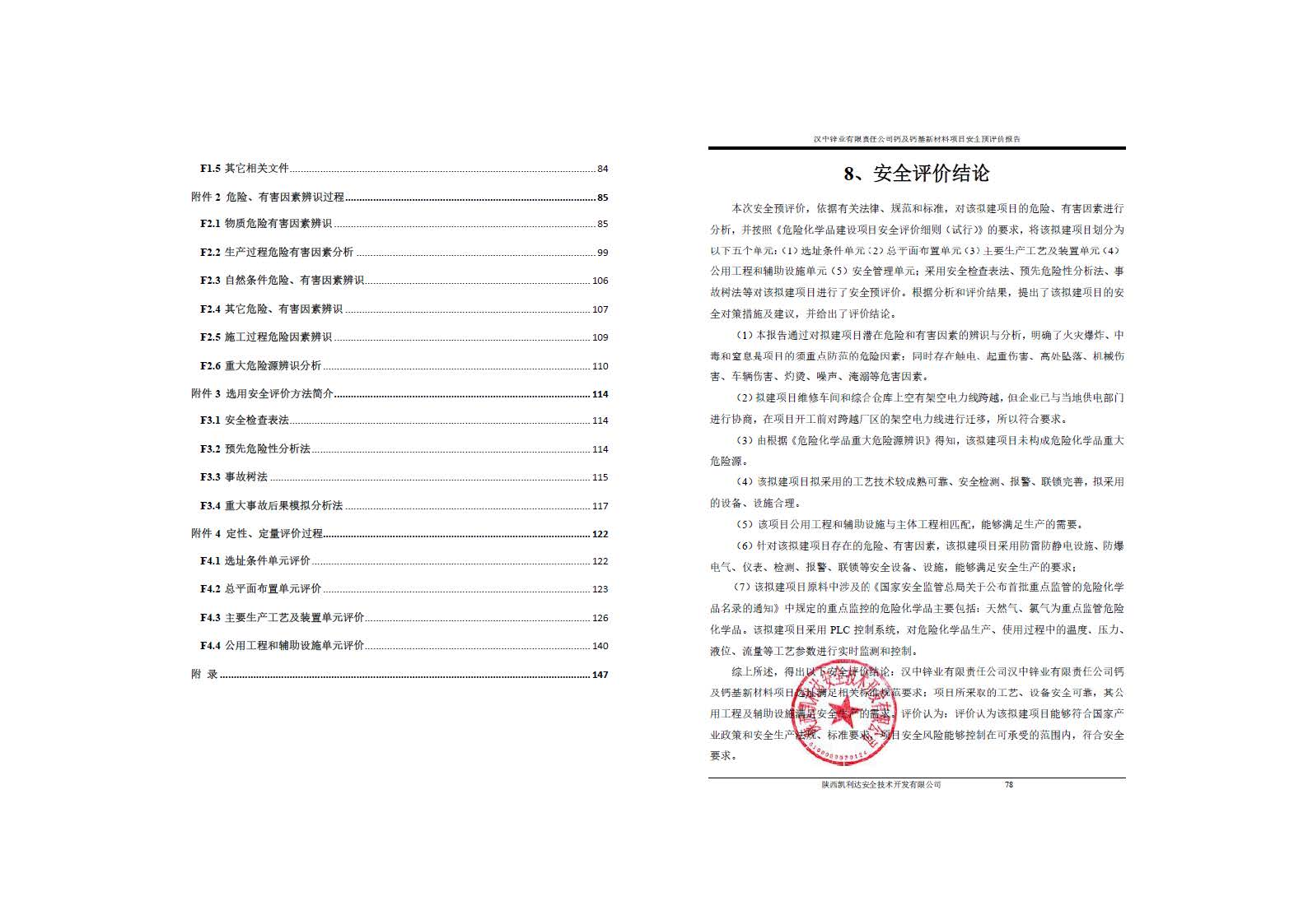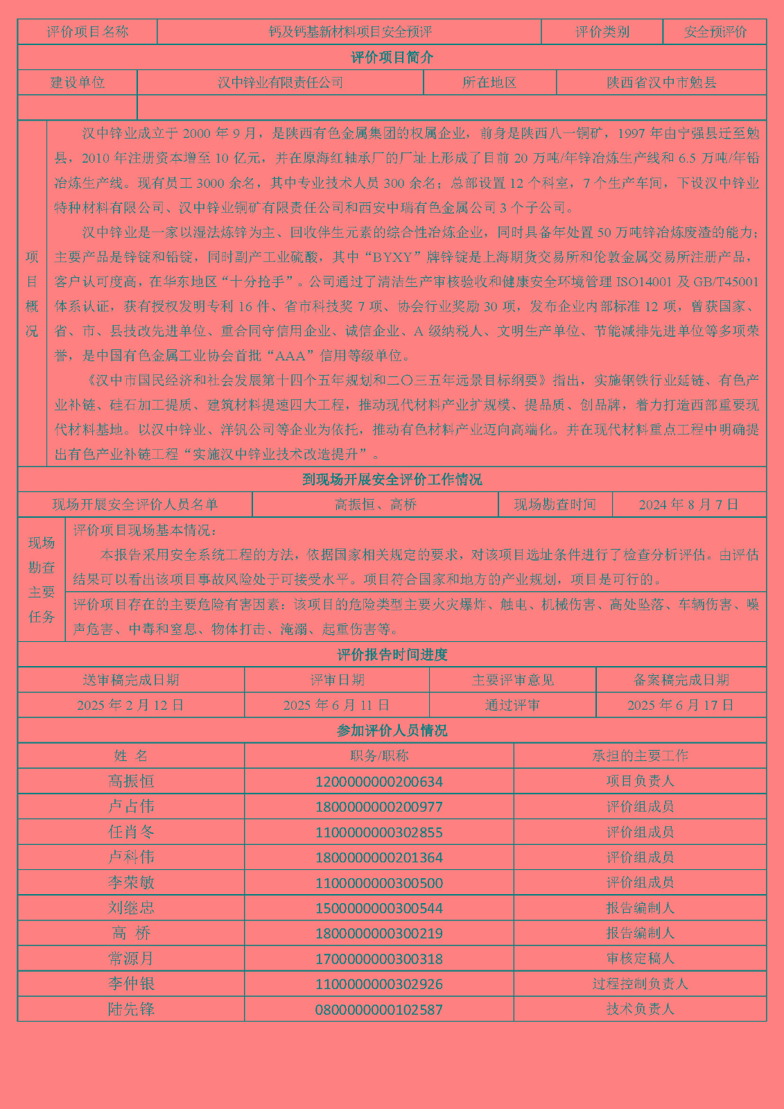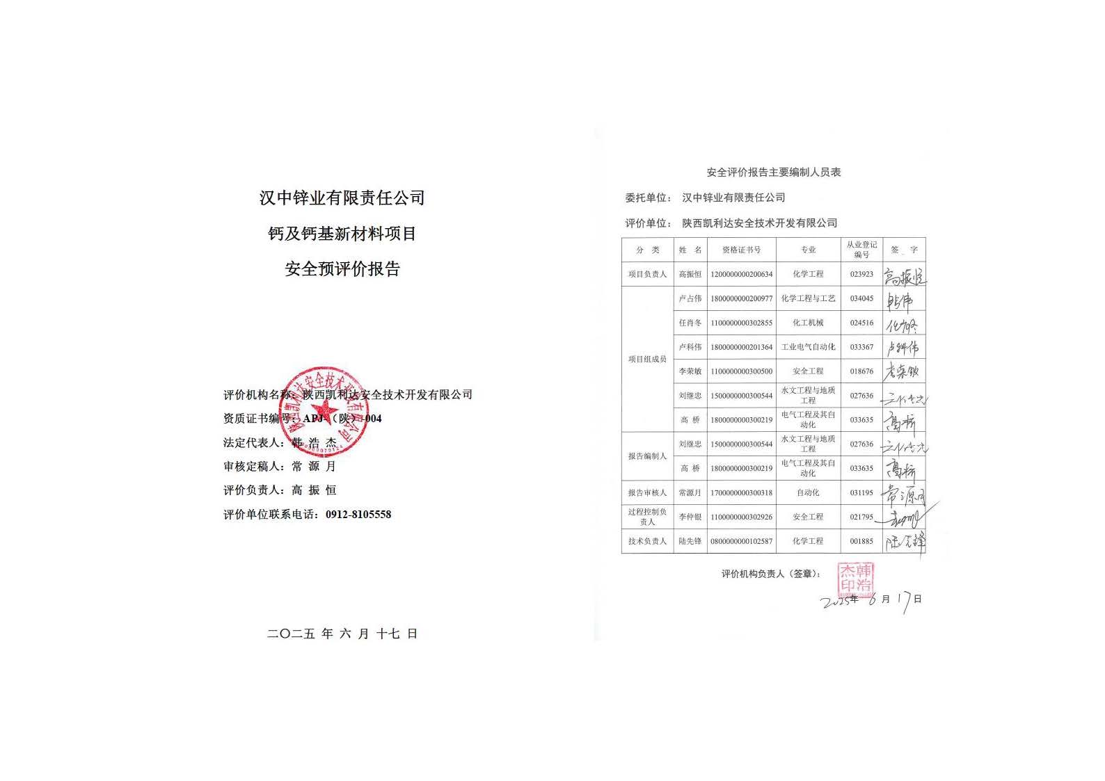 汉中锌业有限责任公司钙及钙基新材料项目安全预评价