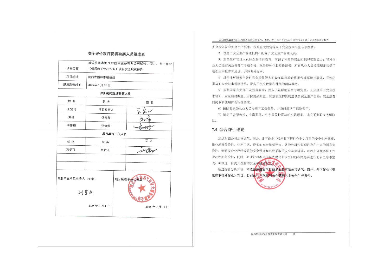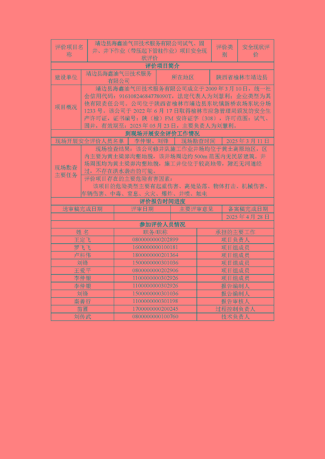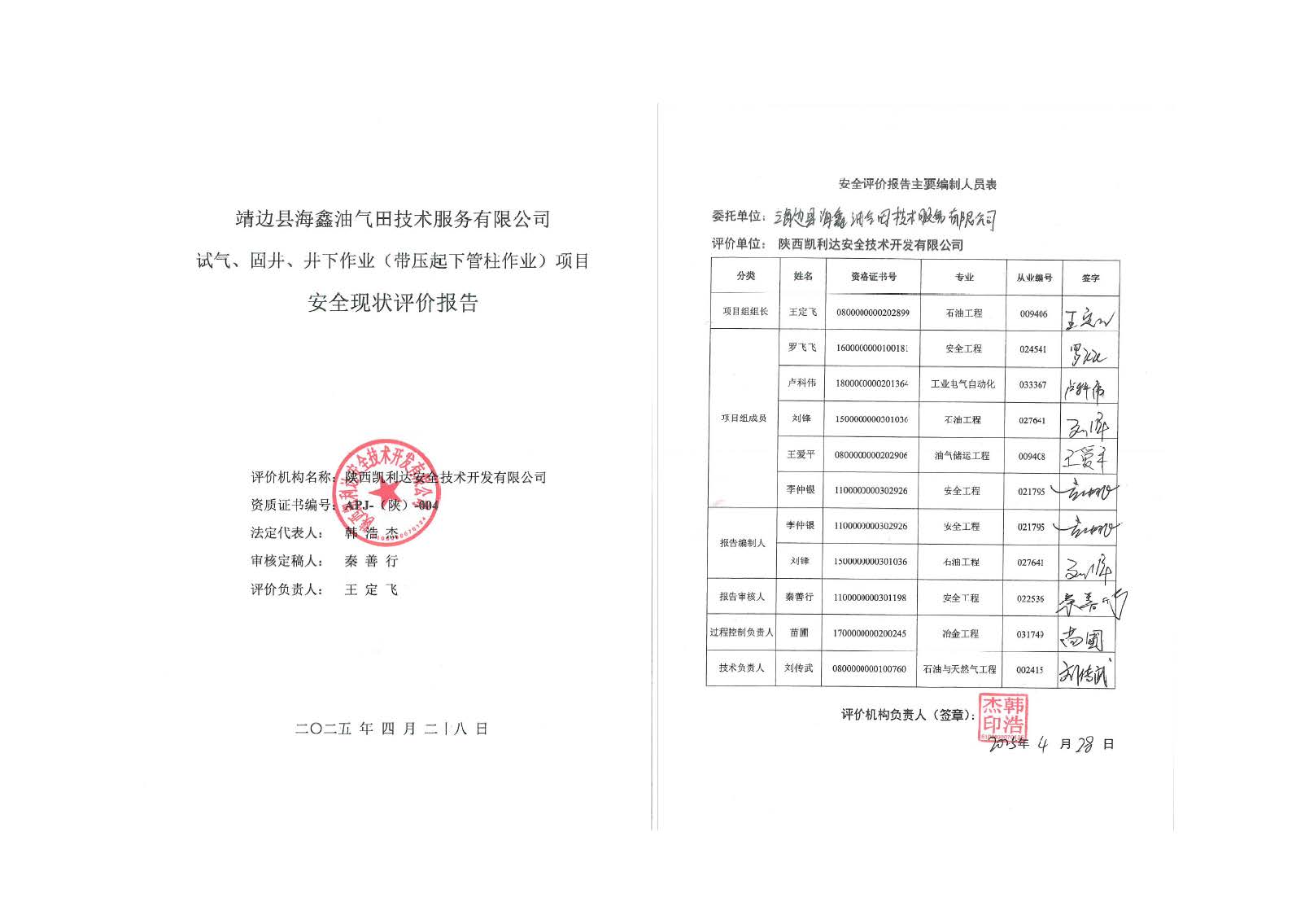 KLDAP[2025]-1.20靖边县海鑫油气田技术服务有限公司试气、固井、井下作业(带压起下管柱作业)项目安全现状评价