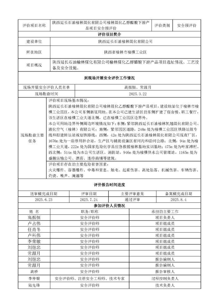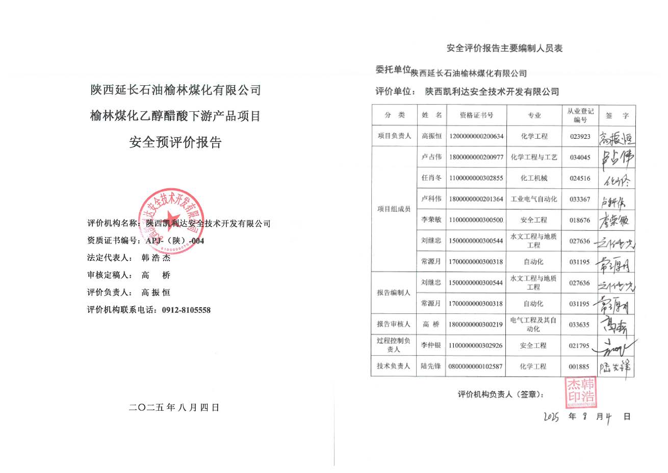 KLDAP[2025]-2.9-陕西延长石油榆林煤化有限公司榆林煤化乙醇醋酸下游产品项目安全预评价