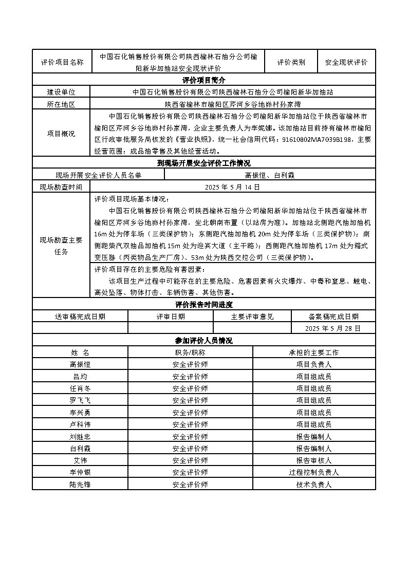 中国石化销售股份有限公司陕西榆林石油分公司榆阳新华加油站安全现状评价报告